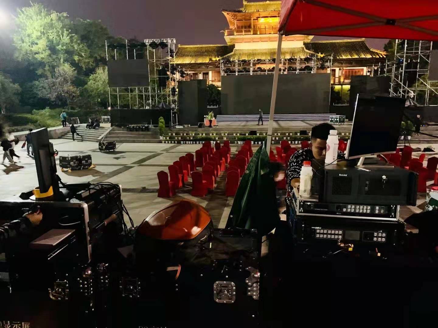 在下午的彩排环节,天气阳光明媚,然而到了晚上活动正式开始以后,却下起了雨。舞台有部分遮掩,摄影席却完全暴露在雨中。然而,只要甲方没喊停,活动还没结束,武汉巨幕文化传媒有限公司摄制组就绝对不会擅离职守。摄影助理为摄影老师们拿了伞,但老师们都默契地把伞完全护在机器上,自己却在于里淋着,目的是:人可以淋湿,但不能影响活动的拍摄。